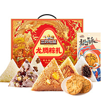 蛋黄鲜肉粽130g*1 精典鲜肉粽130g*1 金丝蜜枣粽130g*1 红袍豆沙粽130g*1 八宝杂粮粽130g*1 桃酥200g*1 鸭蛋60*4*1 |